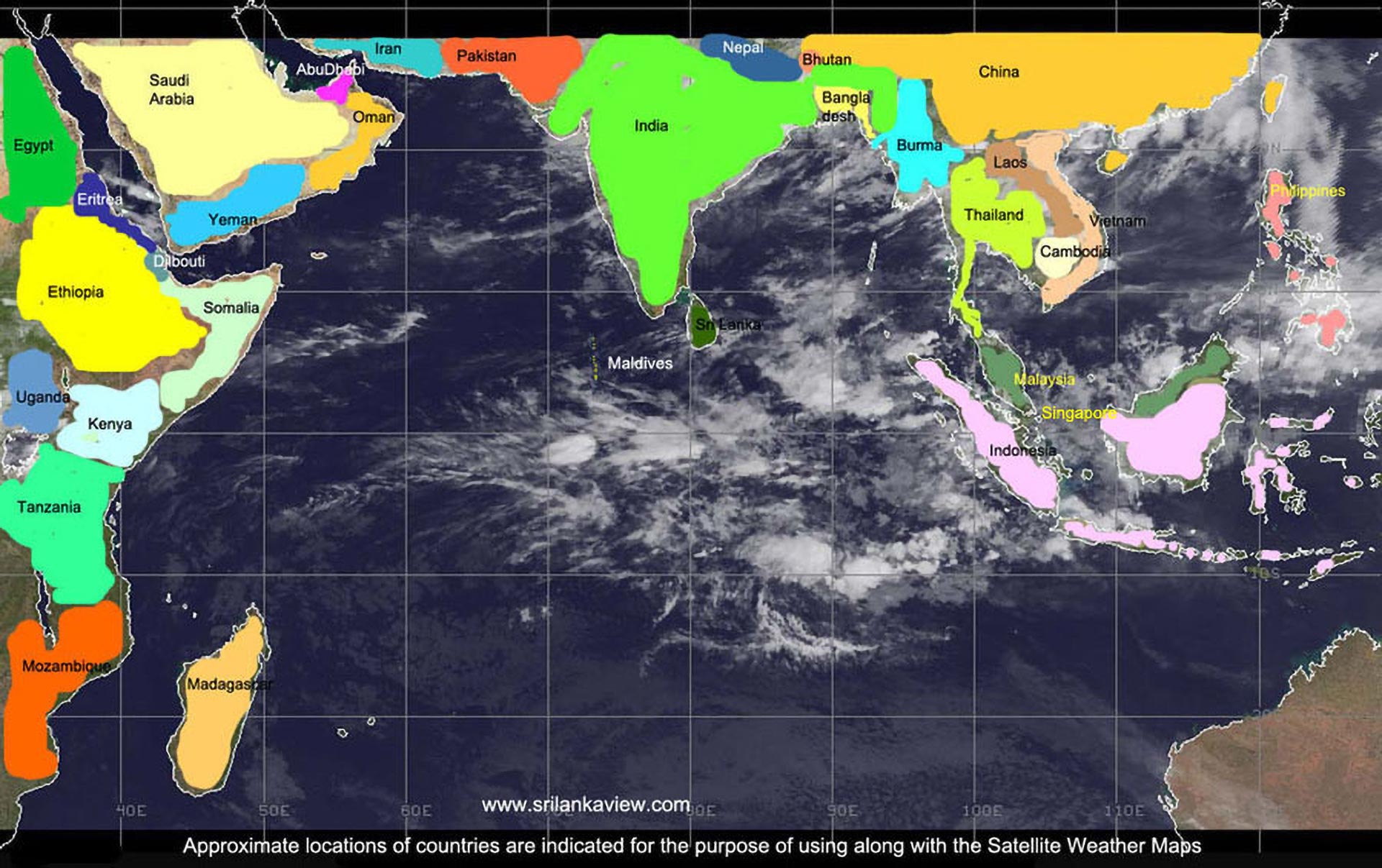 A basic knowledge on how to identify the rain clouds on a map showing Asian, Middle Eastern and East African Regions and the Indian Ocean, will enable the visitor to know exact weather conditions at the moment and the possible weather pattern for today,tomorrow or the next week also.