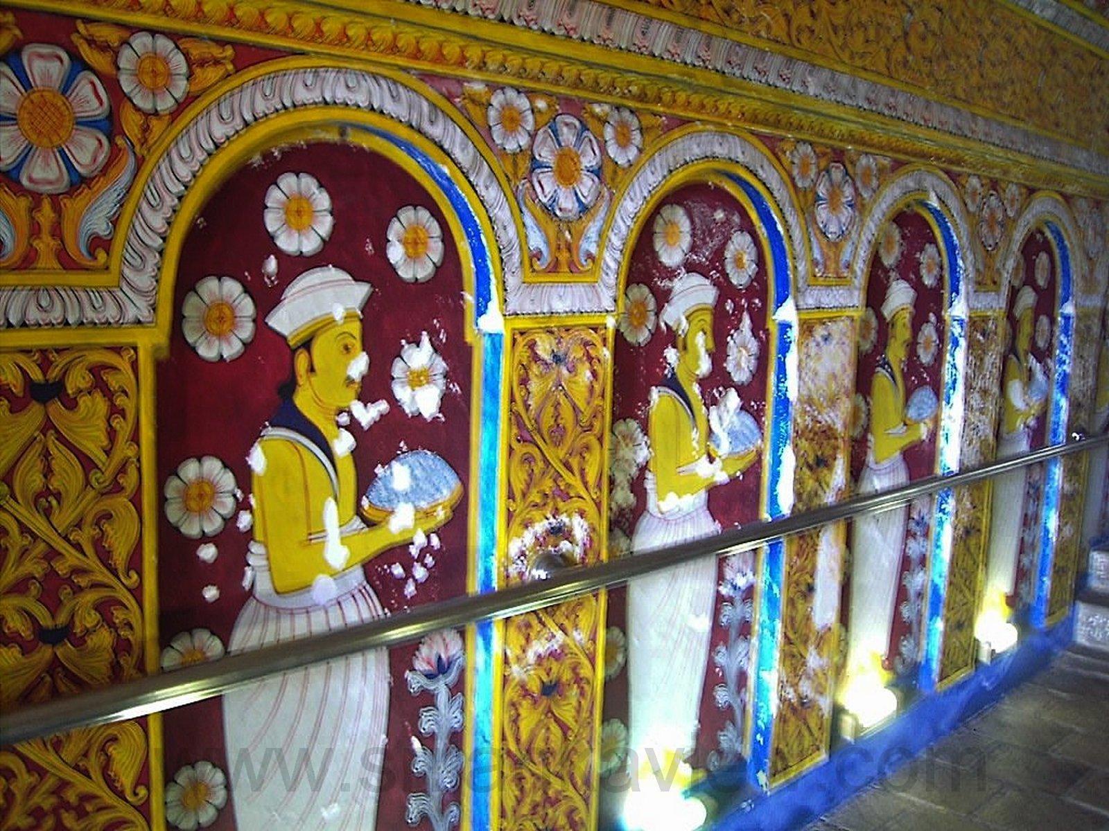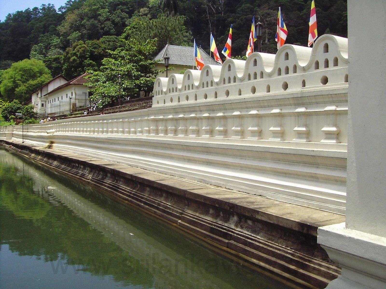 A The roadway running in between the Temple of the Tooth and the King's Palace and the Natha Devale temple is not being used as a road now. Earlier it was the access road to the King's Palace and the Tooth Relic Temple. There is a thick short wall with a feature of a triangle shape running along the border in between the Tooth relic temple and the road called "Diyareli Bamma" which means Wave swell Wall. There are triangle shaped cavities running throughout the width which were used to place lighted oil lamps. There is a moat between this wave swell wall and another wall in a higher elevation built onto the front side of the Temple of Tooth Relic which has a curve design called "Walakulu Bamma" or Cloud swell wall. This Cloud swell wall can be found in many temple paintings of Kandyan era.