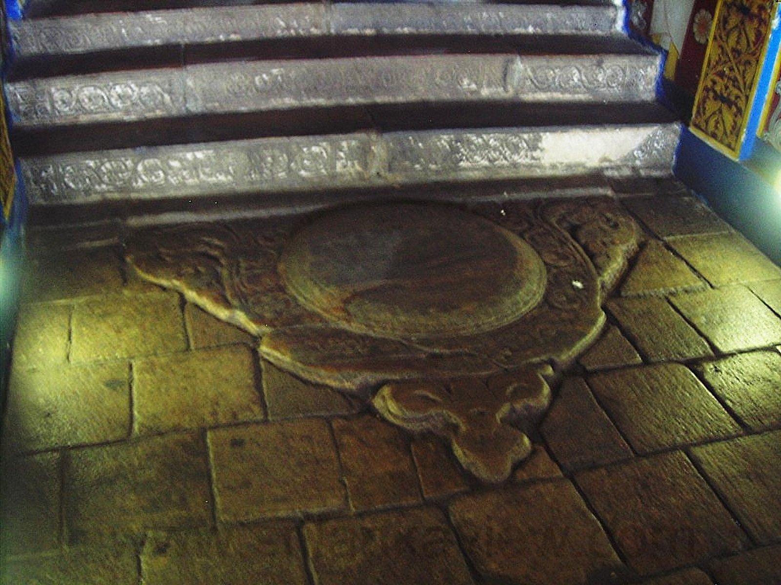 The entrance to the Tooth Relic Temple is through a stone slab bridge over the moat and the Great Gate or the Maha Vahalkada is built on the bridge. The Gates are no more there now but old hinges for the doors can be noticed. A Moonstone or a "Sandakada Pahana" of Kandyan design was placed at the entrance to the Bridge way by the road which leads to a five step stairway to the stone bridge. This entrance way is common to both the King's Palace and the Tooth Relic Temple and diverts to the northern and southern directions after coming over the bridge leading the way to the Palace and the Temple. During the Kandy Perahera procession the Maligawa Tusker elephant carrying the Casket of a Tooth Relic (Dalada Karaduwa) enters through the bridge to this area to have the Dalada Karaduwa placed on a specially decorated ornamental casket tied onto his back.