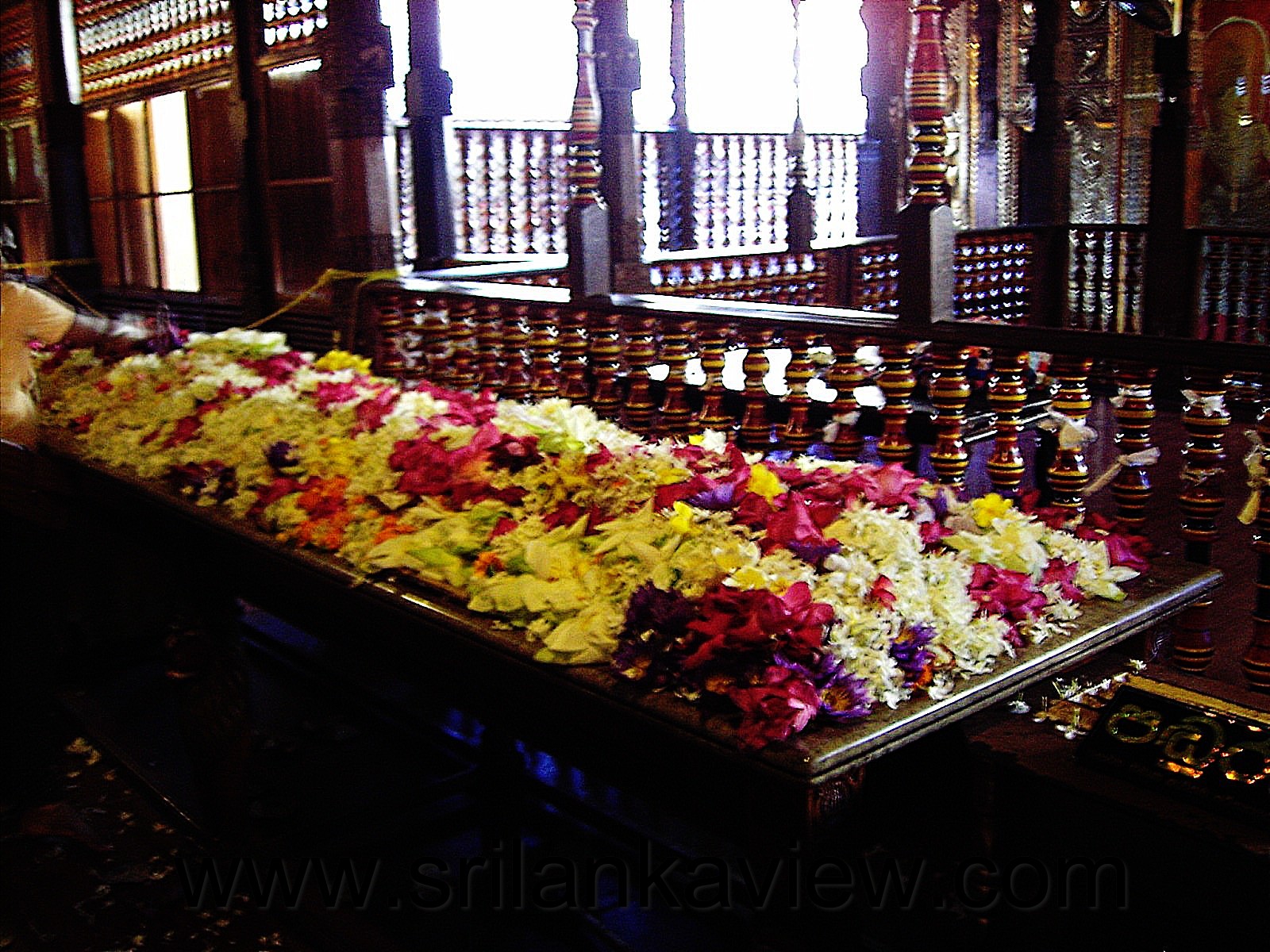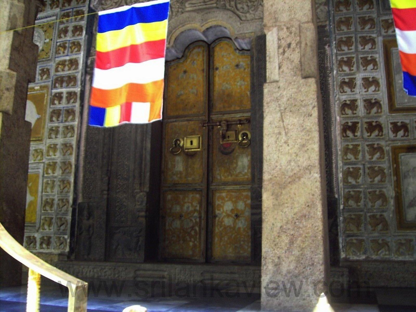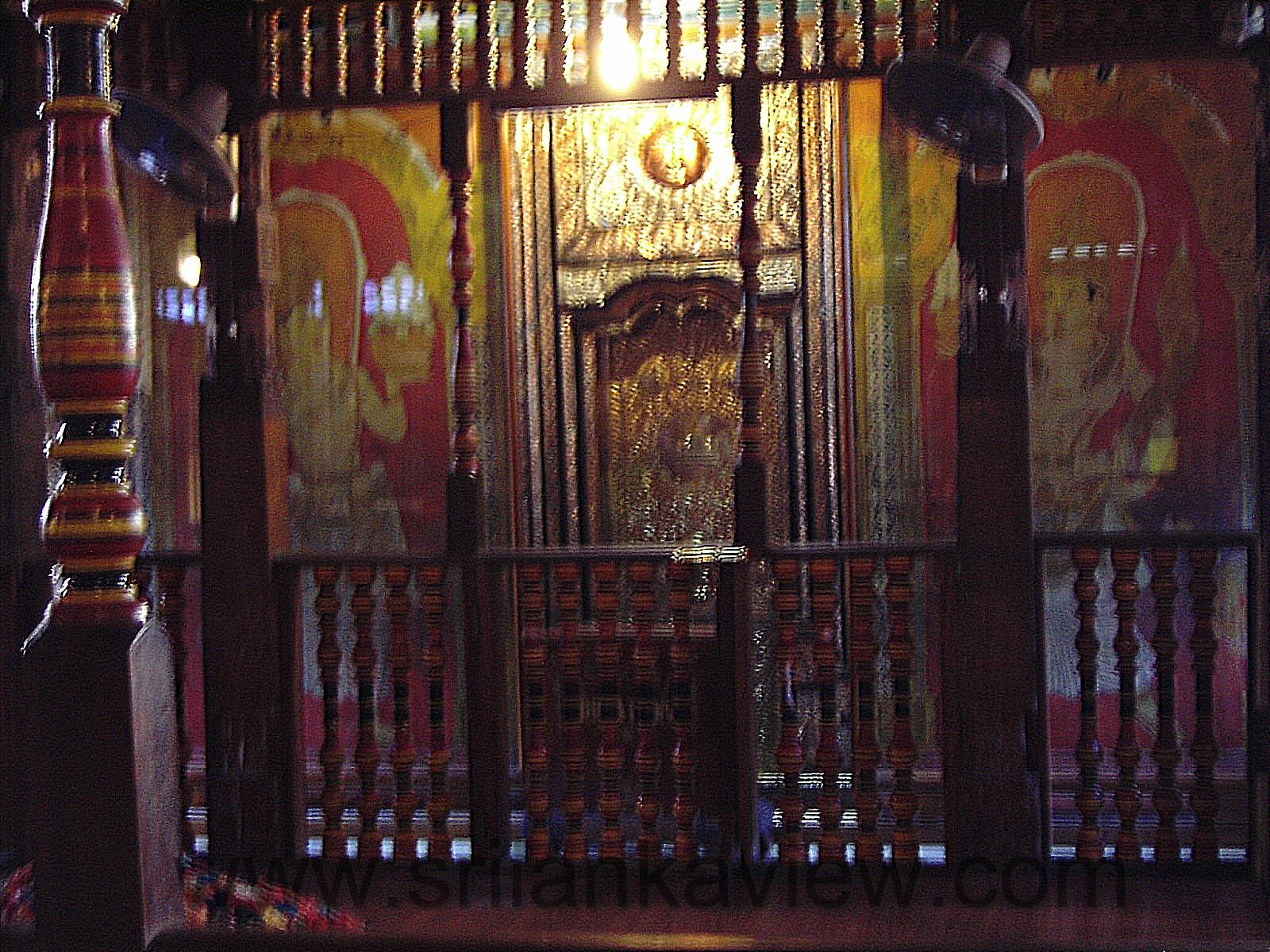 Doorway to the Vedahitina Maligawa or the Tooth Relic chamber having door frames covered with silver plaques and hava the symbols of sun and moon embossed on them. The Tooth Relic is enclosed by seven golden, precious gem studed caskets. The outer most casket is partially covered by valuable jewellery offered to the relic by Kings and dignitaries of the past. The Perahera Karanduwa or the casket taken during the perahera pocession is kept next to the relic casket. Monks of Maha Viharas of Malwatta and Asgiriya partake in daily rituals on half yearly duty basis turns. During the daily service performance the drummers beat the drums from the hewisi mandapaya below.