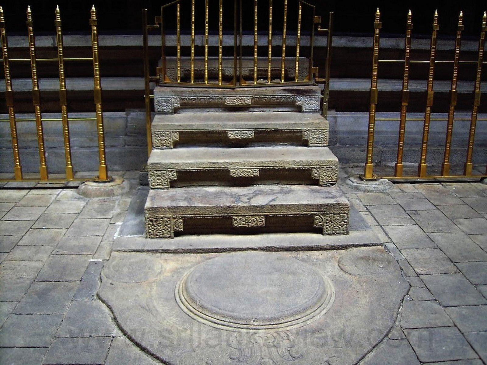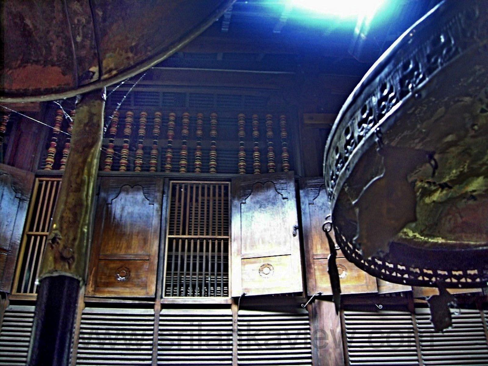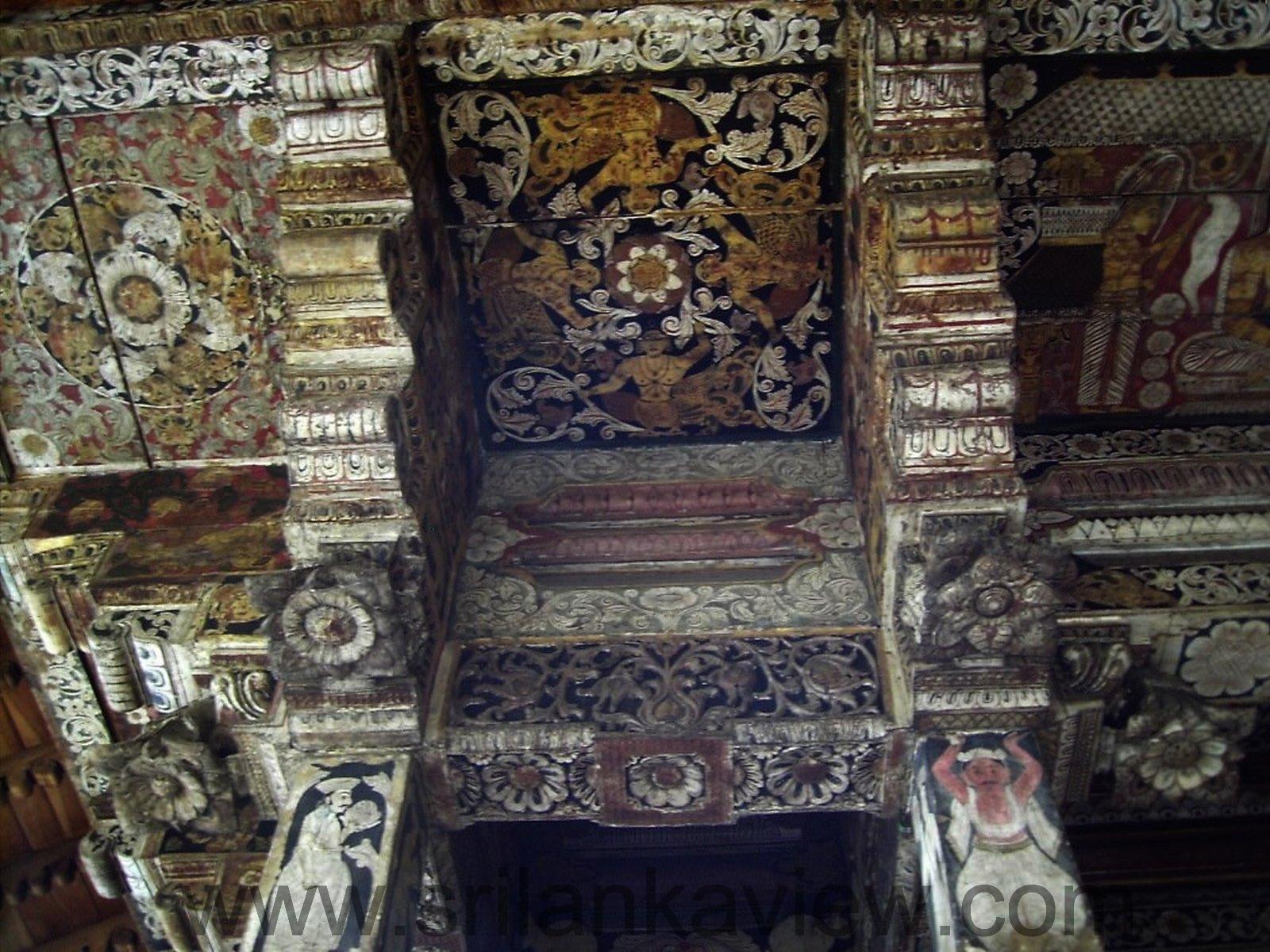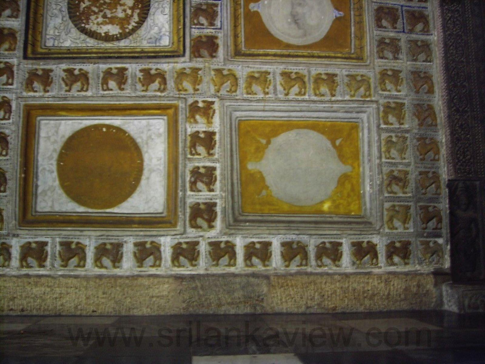 Doorway to the Vedahitina Maligawa or the Tooth Relic chamber having door frames covered with silver plaques and hava the symbols of sun and moon embossed on them. The Tooth Relic is enclosed by seven golden, precious gem studed caskets. The outer most casket is partially covered by valuable jewellery offered to the relic by Kings and dignitaries of the past. The Perahera Karanduwa or the casket taken during the perahera pocession is kept next to the relic casket. Monks of Maha Viharas of Malwatta and Asgiriya partake in daily rituals on half yearly duty basis turns. During the daily service performance the drummers beat the drums from the hewisi mandapaya below.