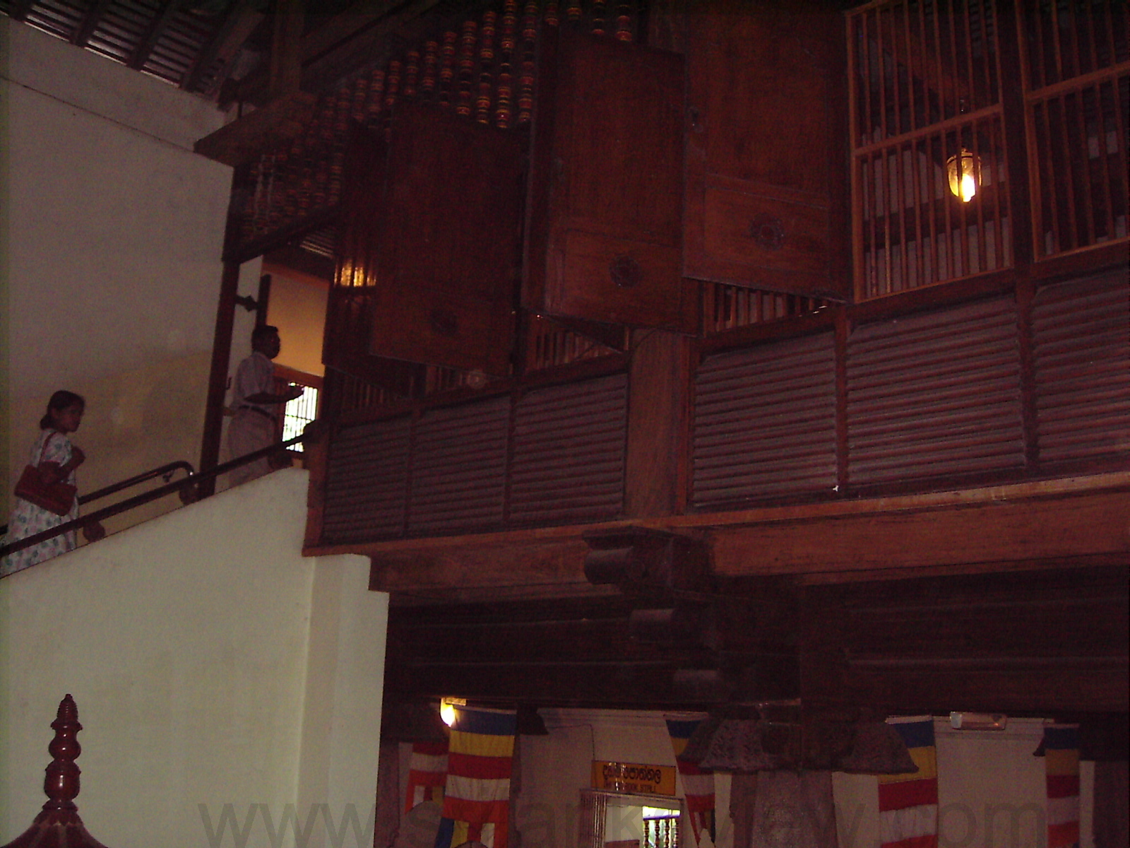 There are three rooms in the upper chamber. The first and the second rooms are called as Handun Kunama or the Sandlewood room. This space is a Gandhakuti or a Perfumed chamber. The exposition of the Tooth Relic takes place in the first room on special occations. It is in the third room that the Tooth Relic is residing and is called Vedahitina Maligawa. The first and the second chambers are called Handun Kunama or Sandlewood chamber. During the exposition of the Tooth Relic which takes place from time to time , it is exhibited to the devotees from the first room which the accompanying photograph depicts.